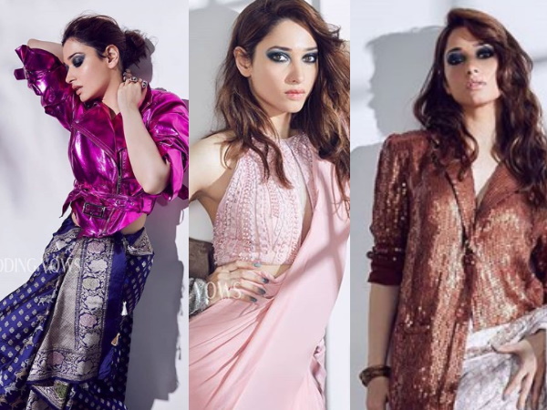 वेडिंग वोव्स मैगजीन फोटोशूट के दौरान तमन्ना भाटिया ने ब्लू आईमेकअप कैरी किया हुआ हैं। तमन्ना भाटिया का ब्लू आईशैडो मेकअप इंटरनेट पर काफी वायरल हो रहा है। ब्लू आईमेकअप में तमन्ना भाटिया गजब की सेक्सी लग रही हैं। तमन्ना भाटिया ने हाल ही में साड़ी के साथ जैकेट पहन कर वेडिंग वोव्स मैगजीन के लिए बोल्ड फोटोशूट करवाया है। तमन्ना भाटिया का ये फैशनेबल फोटोशूट इंटरनेट पर काफी पसंद किया जा रहा हैं। उनके फोटोशूट की खास बात यह है कि उन्होंने सीक्विन जैकेट में हॉट पोज देते हुए फोटोशूट करवाया है।