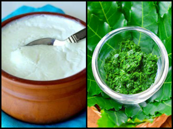 नीम की पत्तियों को धो कर साफ करें और ब्लेंडर में 2 चम्मच पानी के साथ मिला कर पीस लें। फिर इस पेस्ट में 2 चम्मच दही मिलाएं और पेस्ट तैयार करें।