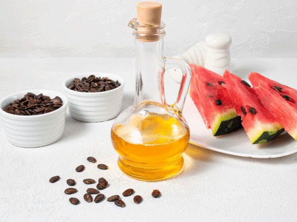 तरबूज के बीच के तेल में विटामिन ए, बी और ई, मैग्नीशियम, ऑयरन और पोटेशियम पाया जाता है। इसके अलावा तरबूज के तेल में एसिड और स्टीयरिक एसिड पाया जाता है जो कि स्किन को जवां बनाने में मददगार है। ग्लोइंग और बेदाग स्किन के लिए तरबूज का तेल बेहद फायदेमंद है।