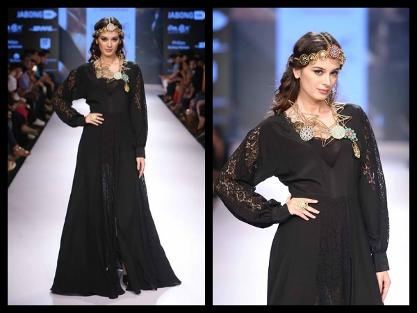 रैंप पर ब्लैक कलर के गाउन तथा जियोमेट्रिकल नेकलेस में काफी अच्छी दिख रही थीं। उन्होने साथ में मांग टीका भी पहन रखा था।
