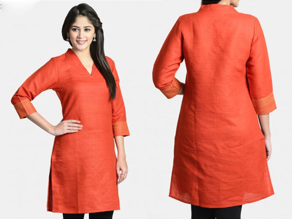 औरेंज कलर का वी-लाइन कुर्ता, डेनिम पर पहनने के लिए बेस्ट है। यह कलर भी आजकल काफी चलन में है।