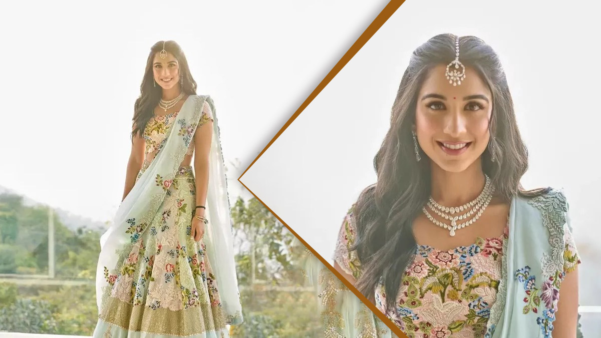 राधिका मर्चेंट सटल और सोबर लुक ज्यादा पसंद करती है। अपने शादी की इस रस्म के लिए राधिका ने पेस्टल शेड वाले स्काई ब्लू कलर के लहंगे को चूज किया। इस खूबसूरत लहंगे को डिजाइनर अनामिका खन्ना ने डिजाइन किया है। इस लहंगे में एम्ब्रोइडरी से लेकर काफी बारीकी से फ्लोरल वर्क किया गया है।