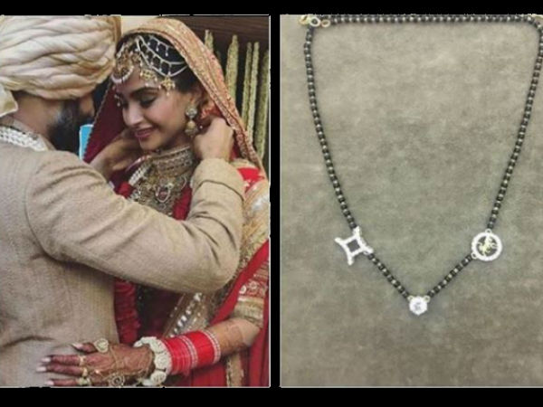 सोनम की राशि मिथुन है जिसका चिह्न उल्टे हाथ की तरफ बना है जबकि आनंद की राशि सिंह है जिसका चिह्न सीधी तरफ बना है। इन दोनों के बीच में एक सॉलिटेयर लगा है। उशीता ने खुद अपने इंस्टग्राम पेज पर सोनम के मंगलसूत्र की तस्वीरें शेयर की हैं। इसके साथ उन्होंने कैप्शन दिया: सोनम को शादी की बहुत बधाई, ये है सोनम का मंगलसूत्र है।