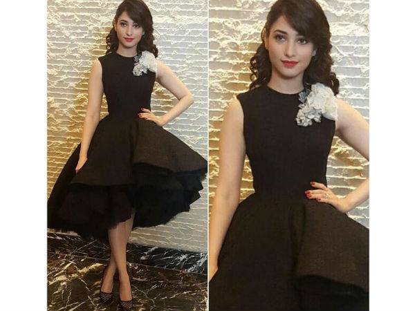 तमन्ना की यह ब्लैक ड्रेस काफी लोंगो दृारा पसंद की गई और की भी क्यूं ना जाती इसका डिजाइन जो इतना खास था। ड्रेस के लेफ्ट शोल्डर पर सफेद रंग का वाइट फ्लोरल एप्पलीक लगा हुआ था।