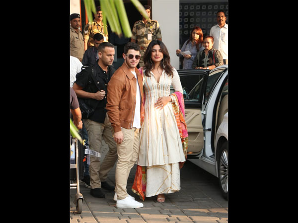 एयरपोर्ट पर प्रियंका मंगेतर का हाथ थामे इंडियन आउटफिट में बेहद खुश नजर आईं। इस दौरान प्रियंका को व्हाइट कलर के फ्रॉक सूट विद प्लाजो और मल्टी कलर की चुनरी में देखा गया जबकि, निक वेस्टर्न आउटफिट में दिखे।