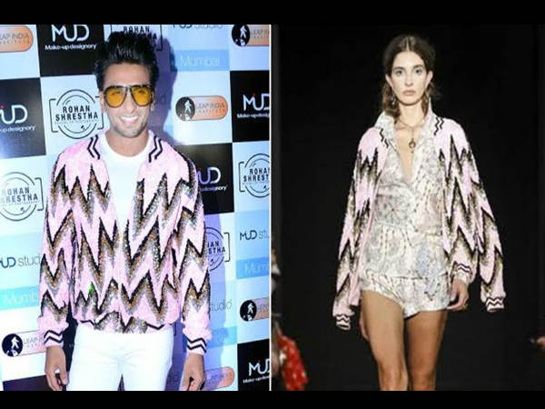 रणवीर ने जो जैकेट पहना थी वह डिजाइनर मनीष अरोरा के महिलाओं के लिए लाए गए स्प्रिंग 2018 कलेक्शन से है। लेकिन इस महिलाओं के जैकेट में भी रणवीर का अंदाज शानदार था। हालांकि हमेशा की तरह रणवीर अपने इस बेहद अगल अंदाज में भी काफी रॉकिंग लग रहे थे