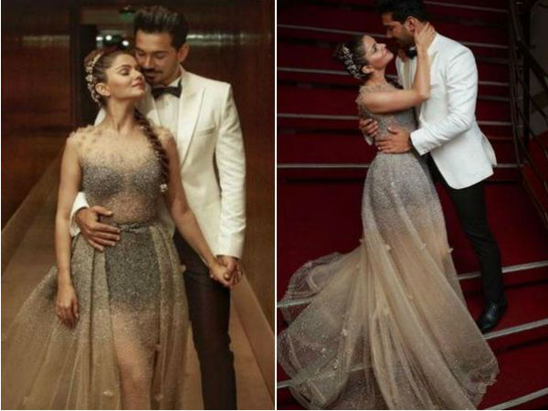 रूबीना के शीर गाउन के साथ उनके हसबैंड अभिनव का वेस्टर्न आउटफिट उन्हें एकदम परफेक्ट कपल वाला लुक दे रहा था। इससे पहले शिमला में हुई अपनी वेडिंग में रूबीना ने अनुष्का शर्मा से इंस्पायर्ड पाउडर पिंक शेड का फ्लोरल आउटफिट चुना था।
