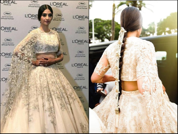 रेड कार्पेट पर सोनम कपूर के हाथों से आनंद के नाम की मेहंदी साफ साफ नजर आ रही थी। सोनम के लहंगे स्टाइल में एक ड्रेप लगा हुआ था जो कि दुपट्टे की तरह लुक दे रह था। इसके साथ सोनम ने middle parting कर लूज चोटी बना रखी थी। इसके अलावा उनके बालों पर लगा हुआ यूनिक परांदा उन्हें लुक को और भी ज्यादा खूबसूरत बना रहा था। अपने लुक को कम्प्लीट करने के लिए उन्होंने चोपार्ड के इयररिंग्स पहने हुए थे।