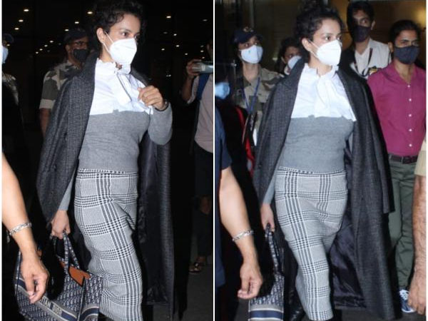 कंगना ने एयरपोर्ट लुक में मोनोक्रोमेटिक लुक को अपनाया। इसके लिए उन्होंने ग्रे कलर की स्वेटशर्ट को पहना, जिस पर व्हाइट नॉटेड कॉलर्ड शर्ट लुक काफी अच्छा लग रहा था। इसके साथ कंगना ने चेकर्ड पेंसिल स्कर्ट को स्टाइल किया। अपने इस आउटफिट की लेयरिंग के लिए कंगना ने ग्रे कलर के ट्रेन्च कोट को चुना। जिसे उन्होंने शोल्डर पर कैरी किया था और यह देखने में बेहद ही स्टनिंग लग रहा था। वहीं फुटवियर में कंगना ने ब्लैक नी-हाई हील्ड बूट्स को स्टाइल किया। अपने इस लुक के साथ कंगना ने हैंड बैग कैरी किया।