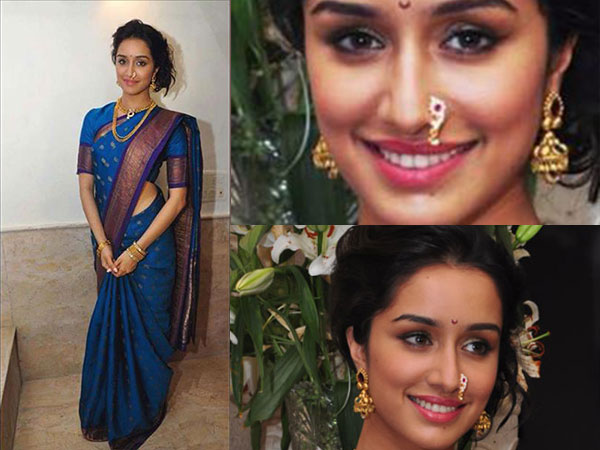 श्रद्धा को देखकर आप कह सकते हैं कि नथ के बिना मराठी लुक अधूरा होता है। सिर्फ एक नथ मिनटों में पंजाबी लड़की को मराठी लुक दे सकती है। श्रद्धा ने सफेद रंग के मोतियों से सजी सुनहरी नथ पहनी है जिसके बीच में लाल रंग के छोटे स्टोन भी लगे हुए हैं।