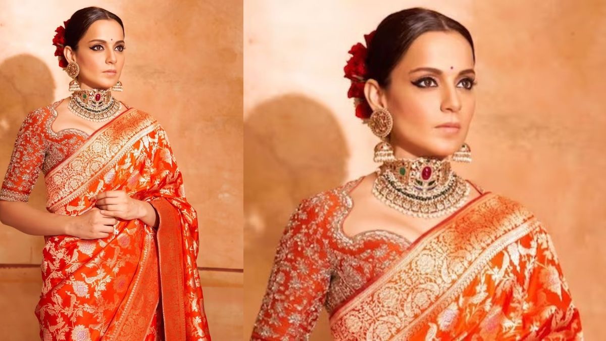 बनारसी साड़ी पहनकर कंगना रनौत ने किया रावण का दहन, यूनिक ब्लाउज डिजाइन ने भी खींचा ध्यान