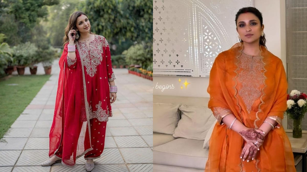 दिवाली 2023 पर परिणीति चोपड़ा ने ज़री वर्क वाला ऑरेंज शॉर्ट कुर्ता पहना था। उन्होंने इसे मैचिंग शरारा और दुपट्टे के साथ पेयर किया था। इस लुक के लिए उन्होंने गुलाबी चूड़े के अलावा कम से कम जूलरी पहनी थी। ग्लैमर के लिए उन्होंने डेवी मेकअप लुक चुना था। पहली लोहड़ी पर न्यूली वेड के लिए यह लुक शानदार रहेगा।