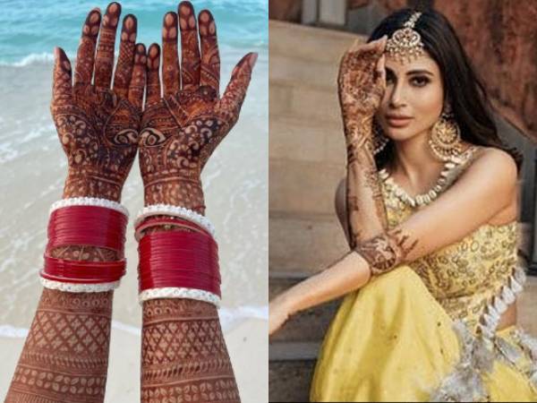 मौनी रॉय ने अपनी शादी के लिए मेहंदी का काफी यूनिक डिजाइन चुना। अगर आप भी पूराने मेहंदी डिजाइन से बोर हो चुकी हैं तो मौनी रॉय से अपनी मेहंदी का इंस्पिरेशन ले सकती हैं। मौनी की मेहंदी के डिज़ाइन में खाली स्पेस सिंपल पर मेहंदी को यूनिक बना रहा है।