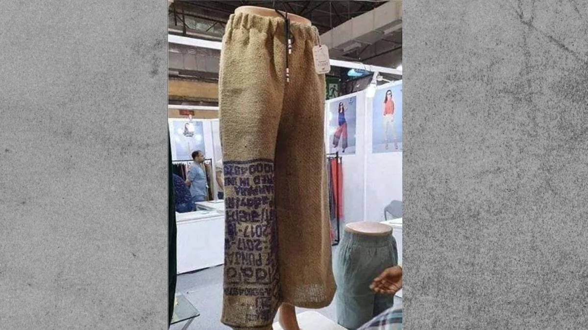 हमने कई बार अजीबोगरीब आउटफिट्स को महंगे प्राइज टैग लगाकर बेचते हुए देखा है। ऐसा ही एक अजीबोगरीब फैशन आउटफिट सोशल मीडिया पर काफी ट्रेंड कर रहा है। आपने भी अपने इंस्टाग्राम पर जूट की बोरी से बना एक पैंट स्टोर पर 60 हजार रूपये में बेचते हुए देखा जा रहा है। जी हां वहीं जूट की बोरी जो जिसमें आलू या गेहूं रखा जाता है जो हमें सब्जी मंडी या बाजारों में आसानी से देखने को मिल जाती है।