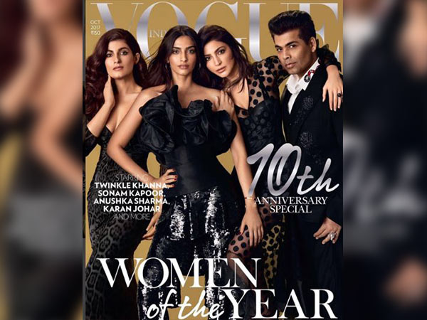 इस कवर फोटोशूट में मिस फनी बोन्स ने रोबर्टो कावल्ली एनिमल प्रिंट का लो नैक वाला ब्लैक गाउन पहना है। वहीं सोनम कपूर ने हाउस ऑफ उस्मान यूसुफजादा की ब्लैक ऑफ शॉल्डर रफल्ड टॉप और बिल्ंगी पेंटस पहनी है। वहीं अनुष्का शर्मा फ्रैंसेसो स्कोगनामिग्लो की शीर लेस ड्रेस में दिखी। वहीं इन प्रिटी वुमन्स के साथ करन जोहर गुच्ची के शर्ट और निकिता जयसिंघनी के कस्टम मेड जैकेट और ट्राउजर में नजर आएं। इसके साथ ही उनके हाथ में गुज्जी की स्टेटमेंट रिंग्स नजर आई।