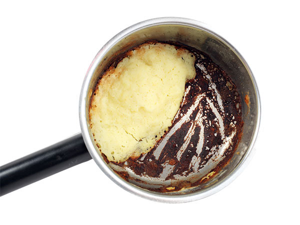 जले हुए बर्तन में नमक और पानी डाल कर खौलाएं। इसे 4 मिनट तक के लिये उबालें। फिर दाग को बर्तन धोने वाले तार या ब्रश से साफ कर लें।