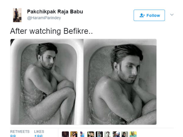 उनकी फिल्म बेफ्रिके से एक फोटो इन दिनों टि्वटर पर वायरल हो रही है। जिसमें रणवीर बथ टब में न्यूड लुक में दिखाई दे रहे है। और इस वजह से टि्वटर पर उनके फॉलोअर्स और टि्वटर बाजों ने उन्हें खूब ट्रोल किया है।
