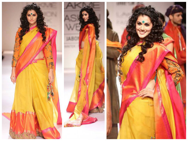 तापसी पन्नू जो किसाउथ इंडियन एक्ट्रेस हैं, उन्होने गौरंग शाह के कलेक्शन के लिये रैंप पर कैट वॉक की। उन्होने पीले और चौड़े गुलाबी रंग के बार्डर वाली साड़ी पहन रखी थी।