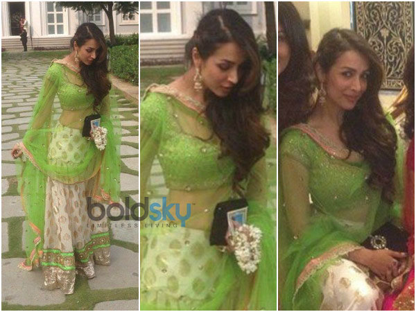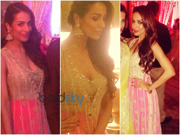 अर्पिता की शादी में काफी सारे रिलेटिव्स आए हुए थे और वही सभी एक से बढ कर एक दिखाई दे रहे थे। शादी की त्यारी के पहले दिन मलाइका ने गुलाबी और गोल्डन मिरर वर्क का लहंगा पहना हुआ था , जिसकी डिजाइनर अर्पिता मेहता थीं। मलाइका ने कानों में मोतियों का झुमका, हाथों में शानदार क्लच और गोल्ड कड़ा पहना था। यह दिन अर्पिता के संगीत और मेहंदी का था।