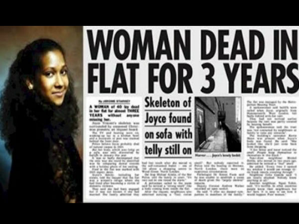 मरने से कुछ समय पहले तक ब्रिटिश महिला,जॉइस कैरोल विन्सेन्ट अपने दोस्तों के साथ थी। फिर वह अचानक वहां से निकल गई और कभी भी नहीं मिली। किसी को तब तक नहीं मालूम चला जब तीन साल के बाद उनके घर से उनकी लाश मिली।