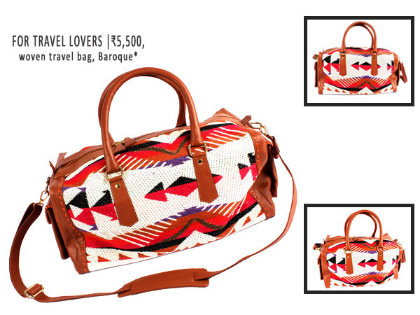 ट्रेवल करते समय एक स्टाइलिश बैग कैरी करें। यह बैग बरॉक दृारा है जिसकी कीमत है 5,500 रू। अधिक जानकारी के लिये क्लिक करें www.baroque.in