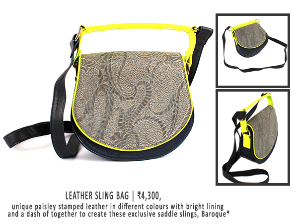 यह लेदर स्लिंग बैग काफी स्टाइलश और थोड़ा सा रंगीन है। इसकी कीमत 4,300 रू है। अधिक जानकारी के लिये क्लिक करें www.baroque.in