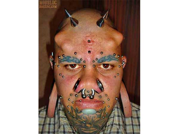यह शख्स, श्रेक की तरह दिखना चाहते थे लेकिन अब ये बेहद डरावने लगते हैं। इन्होंने पूरे चेहरे पर पियरर्सिंग करवा रखी है और इनके माथे पर गूमढ़ भी निकल आया है। समझने वाली बात तो ये हैं कि जब ये एयरपोर्ट या किसी भी सुरक्षा व्यवस्था वाली जगह पर मेटल डिटेक्टकर से गुजरते होंगे तो इन्हें कितनी जटिल प्रक्रिया से गुजरना पड़ता होगा।