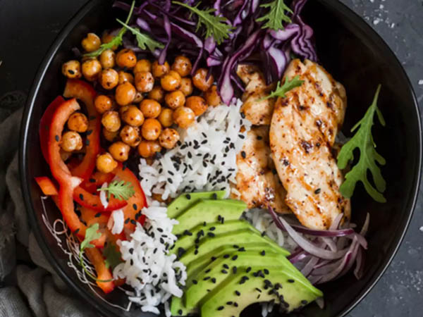 डिलिशियस डिश है जिसे चिकन ब्रेस्ट, चावल, छोले, एवोकैडो, काले तिल,
