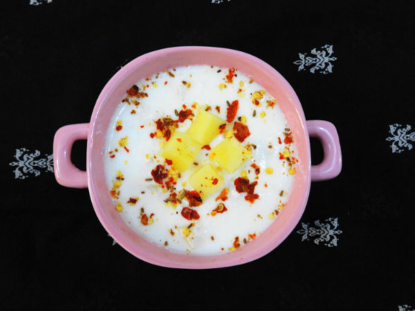- उबले हुए आलू को छीलें और उसके छोटे टुकडे़ कर के दही में मिक्स करें।