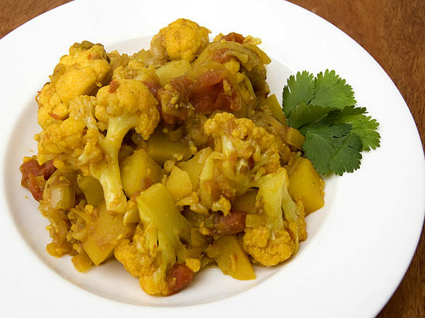 - आधे मिनट तक चलाएं, फिर कटे आलू और गोभी के फूल डालें।